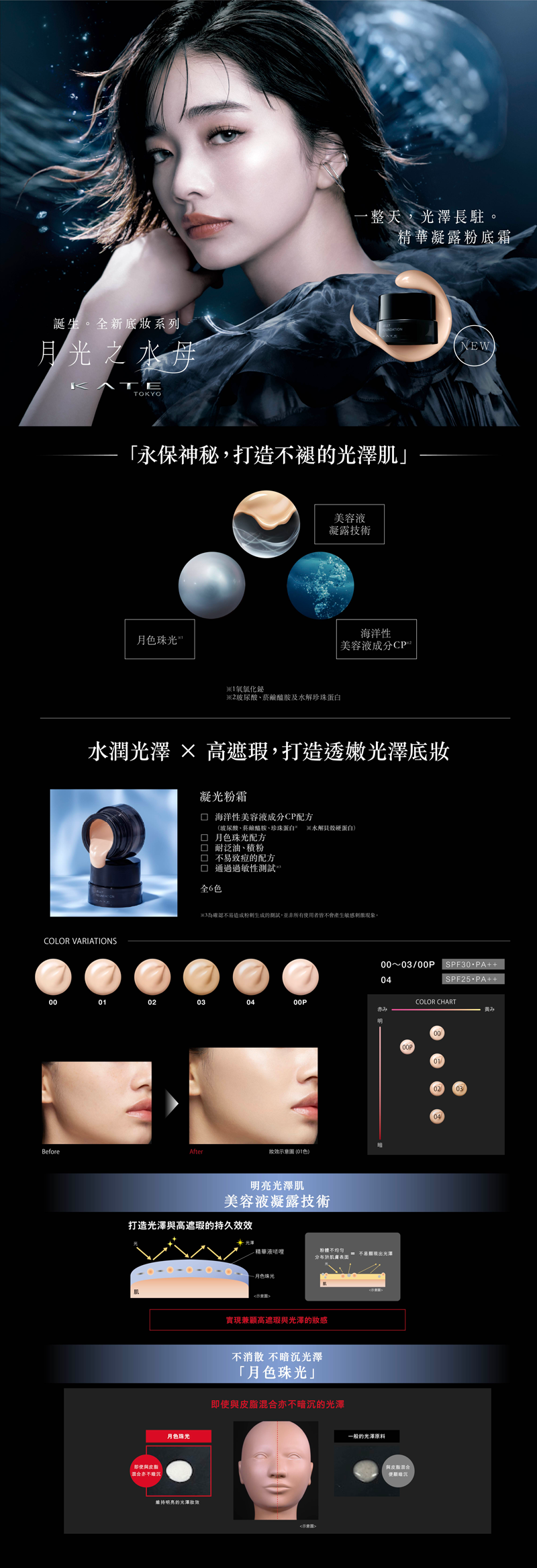 採用美容液凝露技術,緊密貼合肌膚的美容凝露粉底,長時間維持透嫩光澤妝效,不易泛油光。